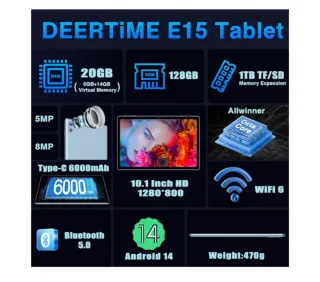 Tablet de 10 pulgadas con Android 15 y procesador Octa-Core. - 30GB RAM + 64GB ROM (ampliable con 2TB TF) - Conectividad 5G y WiFi 6 - Widevine L1, GMS, GPS, Bluetooth 5.0 - Batería de 6000mAh - Cámaras de 5MP y 8MP - Audio de 3.5mm - Incluye teclado, ratón y funda de color azul.