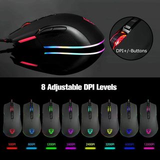 Interruptor de 8 DPI ajustable: nivel de DPI ajustable (500,800,1200, 1600, 2400,3200,12000) para cambiar la velocidad del ratón libremente. Botones de larga duración nominal de 20 millones de clics Programación macro compatible: 6 programaciones pueden definir un botón para activar múltiples funciones, para satisfacer las necesidades de diferentes usuarios. Sistema RGB ajustable: los LED correspondientes pueden personalizar los colores y brindarle un disfrute visual en los juegos. Chip avanzado para juegos: alimentado por el chipset PMW 3360, el ratón para juegos V30 proporciona una precisión de movimiento de alta calidad y r...