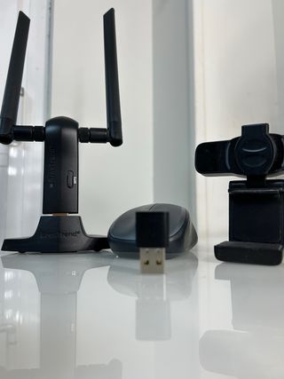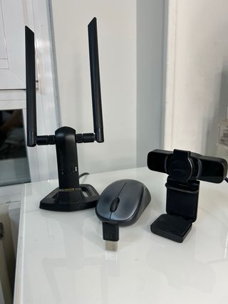 Conjunto de accesorios informáticos. - Ratón inalámbrico. - Cámara web. - Antena WiFi con dos antenas. - Dispositivo Bluetooth.