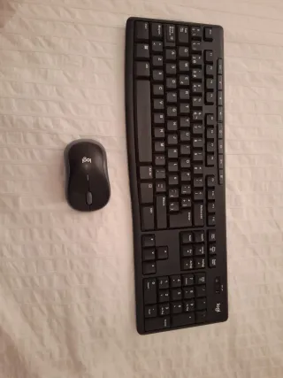 Conjunto de teclado y ratón inalámbricos Logitech en color negro. Diseñados para ofrecer comodidad y eficiencia en tu día a día. - Teclado de tamaño completo con distribución QWERTY. - Ratón ergonómico para un agarre confortable. - Conexión inalámbrica fiable.