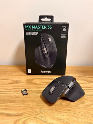Ratón inalámbrico Logitech MX master 3s. En perfecto estado. Muy poco uso. Con caja original y todos sus accesorios, cable de carga y receptor Logitech USB Bolt. Uno de los mejores ratones para trabajar y productividad. - Rueda con desplazamiento infinito. - Rueda scroll lateral. - Conexión rápida de 3 dispositivos. - Botones programables por aplicación. - Mucha duración de batería. - Ergonómico, para trabajar horas de forma cómoda. - Clic silencioso.