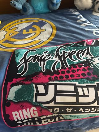 Alfombrilla de ratón con diseño de Sonic The Hedgehog. Presenta un estilo vibrante y dinámico. - Ilustración de Sonic y elementos gráficos. - Tonos verdes y rosas predominantes. - Tiene alguna señal de uso. - Se aceptan ofertas