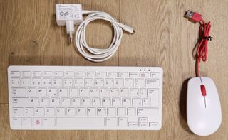Kit de Raspberry Pi 400 con teclado y ratón . Todo en perfecto estado. - Teclado blanco con diseño compacto. - Ratón blanco con cable rojo. - Adaptador de corriente blanco.