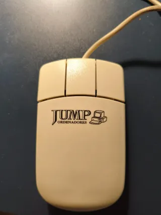 Ratón de ordenador clásico con un diseño retro. - Logo de JUMP ORDENADORES. - Diseño de dos botones y scroll.