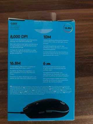 Se vende ratón gaming de la marca líder Logitech, modelo G203, en perfecto estado y con poco uso. • Marca/Modelo: Logitech G203 • Sensor: 8,000 DPI (Sensor preciso para todo tipo de juegos). • Botones: 6 botones programables. • Iluminación: RGB LIGHTSYNC. • Incluye: Caja original.