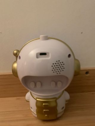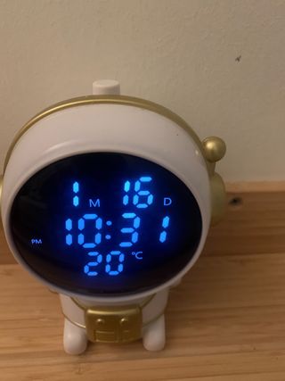 Este reloj digital con diseño de astronauta es un accesorio divertido y funcional para cualquier habitación. - Pantalla LED azul. - Diseño blanco y dorado. - Forma de astronauta. Y se activa en sonidos fuertes incluye cargador Precio negotiable