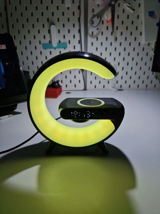 Preciosa lámpara de mesita de noche con cargador inalámbrico integrado. Tiene un diseño curvado y elegante, disponible en dos colores de luz (amarillo y blanco). - Incluye reloj digital. - Carga inalámbrica Qi. - Dos modos de luz. -Altavoz Bluetooth -Puerto para tarjeta sd -Duración de batería de 5-6 -Botones para parar,pasar o retroceder canciones -Precio negociable