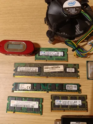Lote de componentes de informática. - Procesador Intel. - Módulos de memoria RAM. - Ventilador de CPU. - Adaptador WiFi USB. - Reproductor mp3 a pilas. No enciende