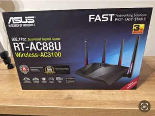 Vendo router gaming de alto rendimiento ASUS RT-AC88U. Ideal para gamers y hogares con múltiples dispositivos que buscan una conexión WiFi rápida y estable. Características principales: WiFi AC3100 (banda dual) Velocidades de hasta 2100 Mbps en 5 GHz y 1000 Mbps en 2.4 GHz Tecnología NitroQAMTM para velocidades WiFi mejoradas 8 puertos Gigabit Ethernet Optimizado para gaming con QoS adaptativo y WTFast Seguridad AiProtection Diseño robusto con antenas externas