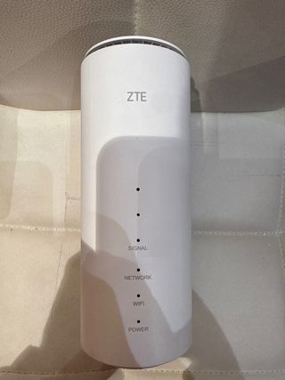Router WiFi portátil de la marca ZTE. Dispositivo compacto y fácil de transportar. - Indicadores LED para señal, red, WiFi y encendido. - Diseño cilíndrico blanco.