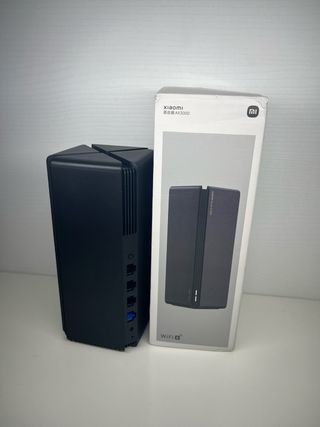 Router Xiaomi AX3200 con diseño moderno y elegante. - Seis antenas para una cobertura Wi-Fi ampliada. - Acabado en color negro. - Superficie superior con ranuras horizontales. No tengo la caja del router (el conjunto incluye solo el router y el cargador/adaptador de corriente)