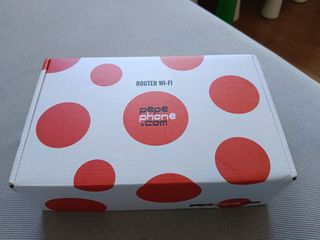 Router Wi-Fi de Pepephone con un diseño moderno y divertido de puntos rojos. - Diseño con puntos rojos. - Etiqueta ROUTER WI-FI visible.