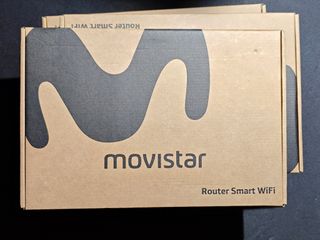 Router Smart WiFi de Movistar en color gris y blanco. Incluye manual de usuario. - Diseño moderno con rejilla frontal. - Indicador 'Fibra' en la parte inferior.