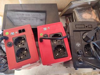 Se venden tres Sistemas de Alimentación Ininterrumpida (SAI) de color rojo y uno negro. Son compactos y cuentan con varias tomas de corriente. - Dos unidades de color rojo. - Una unidad de color negro. - Puertos USB y Ethernet en las unidades rojas. - Indicador LED en la unidad negra.