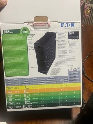 Se vende SAI Eaton Ellipse Eco de 800 VA y 500 W. Está en buenas condiciones. - Protección profesional contra sobretensiones. - Formato extraplano y multiposición. - Batería recargable en 24 horas.