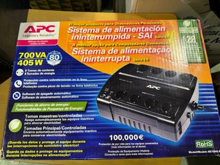 Sistema de alimentación ininterrumpida (SAI) de APC, modelo Serie ES. - Capacidad de 700VA / 405W. - 8 tomas de corriente y 8 tomas de energía. - Protección contra picos de tensión en línea telefónica. - Software de apagado automático.