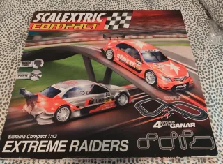 Circuito de Scalextric Compact, modelo Extreme Raiders, escala 1:43. Incluye dos coches de carreras. - Mando turbo. - Puente. - 4 circuitos para ganar. - Dimensiones: 148 x 103 cm. - Recorrido: 4,5 m. -Solo los coches ya lo vale.