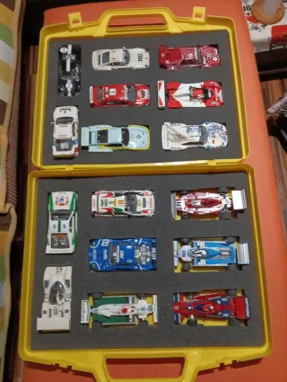 Colección de coches de Scalextric Duelos Míticos. - Incluye 16 coches de carreras. - Modelos variados con diseños distintivos. - Presentados en maletín organizador.