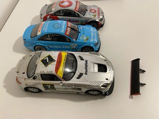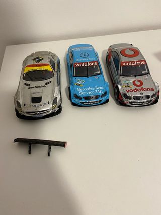 Lote de tres coches de slot Scalextric con licencia Mercedes-Benz. - Coche 1: Mercedes-Benz SLS AMG GT3 Black Falcon Dunlop 24h Dubai. - Coche 2: Mercedes-Benz C-Class Vodafone DTM. - Coche 3: Mercedes-Benz C-Class Vodafone DTM. - Incluye alerón adicional.