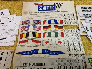 Conjunto de accesorios de decoración para Scalextric. - Banderas decorativas de diferentes países. - Números para coches de competición. - Pegatinas de marcas y patrocinadores. - Logos de marcas como BP, Lucas, Valvoline, Goodyear, STP, Texaco, Dunlop, Ford, Ferrari, etc. - Incluye hojas de pegatinas y números de pit.
