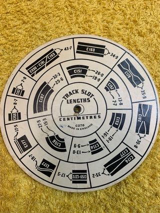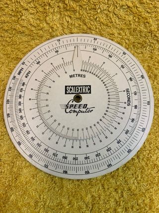Calculadora de velocidad Scalextric antigua, un accesorio clásico para los entusiastas de las carreras. - Escala en MPH, KPH y Metros. - Escala en Segundos. - Diseño circular con dial giratorio.