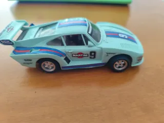 Réplica vintage del coche de carreras Porsche 935 Martini de Scalextric. Un modelo icónico para coleccionistas. - Diseño clásico con los distintivos colores Martini. - Detalles de patrocinadores como Bilstein y Dunlop. - Número de carrera 9 visible.
