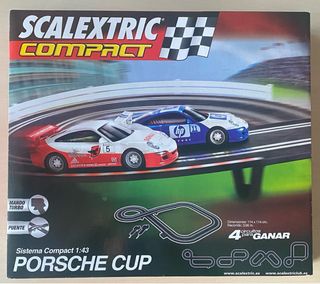 Circuito de slot Scalextric Compact Porsche Cup. - Incluye 2 coches Porsche 911. - Mando turbo. - 4 circuitos para ganar. Ha sido utilizado solamente una vez.