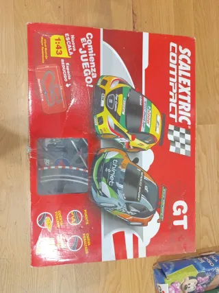 Circuito de coches Scalextric Compact GT. - Escala 1:43. - Fácil montaje y mayor resistencia. - Recorrido de 7,1 m. - Incluye puente y curva peraltada. Solo lleva un mando