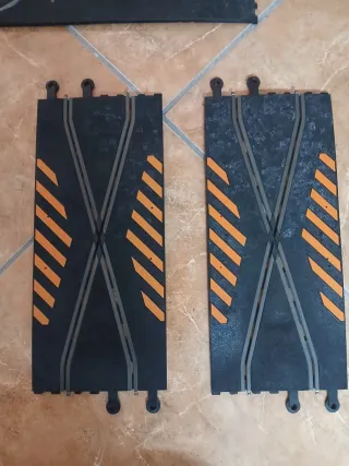 Dos cambios de vía para circuitos Scalextric. - Diseño en color negro con detalles naranjas. - Piezas de plástico con guías metálicas. Más artículos de Scalextric en mi perfil