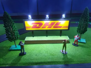 Iluminación para circuitos de slot Scalextric. Añade un toque especial a tus carreras. - Incluye tres focos LED.u - Base con diseño de ladrillo o muro - Señalización de DHL con luces.Set de iluminación LED para circuitos de slot. Luces LED de alta intensidad Compatible para eScalextric carrera ninco scx triang exin scaleauto altaya y otros de slot Pancarta decorativa para circuitos de slot, ideal para ambientar carreras nocturnas. Modelo con porta pilas de 2 pilas Medida base 20X5X2 CMS. Compatible parra circuitos escala 1/43 1/32 1/24 Para circuitos de slot maquetas dioramas y otros escenarios Más modelos en mi perfil
