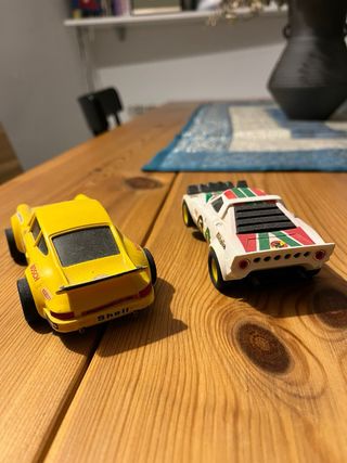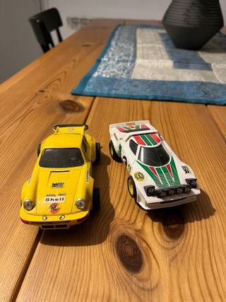 Lancia Stratos. Ref-4055. Fabricado en España. Porsche Carrera RS. Ref-4051. Fabricado en España. Serían para coleccionismo. Hoy en día no creo que funcionen aunque tengas una pista de esa época. Serán de entre 1985-1990.