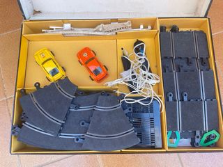Conjunto de pistas y coches Scalextric para montar tu propia carrera. Incluyo mandos inalámbricos y con cable, contador de vueltas etc... Es antiguo y está usado per funciona. - Incluye varias secciones de pista. - Varios coches de competición.