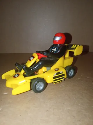 Coche de juguete antiguo de la marca Scalextric. Un modelo de carreras en llamativo color amarillo. - Diseño deportivo con alerones. - Figura de piloto con casco rojo. - Detalles de número '00' en el coche y el piloto.