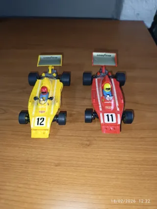 Dos coches de Scalextric de Fórmula 1, con diseño inspirado en Ferrari. Uno es amarillo con el número 12 le falta las escobillas y el otro es rojo con el número 11. - Diseño clásico de F1. - Marca Goodyear en alerones. - Pilotos incluidos.