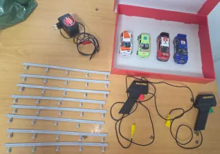 Conjunto de Scalextric con varios coches, mandos y tramos de pista. Como se ve. - Incluye 4 coches de competición. - Dos mandos de control. - Varios tramos de pista rectos.
