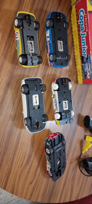 Conjunto de coches de Scalextric y mandos para jugar. Incluye varios modelos de coches de carreras y dos mandos. Estado regular de los coches - Coche Scalextric rojo con detalles blancos y verdes. - Coche Scalextric azul con detalles naranjas y blancos, número 3. - Coche Scalextric amarillo con detalles rojos y blancos, número 15. - Coche Scalextric blanco con detalles negros, marca Toyota. - Coche Scalextric blanco y amarillo con detalles rojos y negros, número 16. - Dos mandos de Scalextric negros con cables.