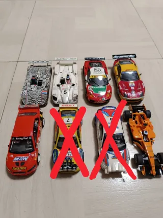 Conjunto de 7 coches de slot de la marca Scalextric, listos para la competición. Precio por lote, por separado preguntar. - Coche 1: Diseño a cuadros con dorsal 16. - Coche 2: Blanco con dorsal 5 y logo SEAT. - Coche 3: Rojo y verde con dorsal 86. - Coche 4: Rojo y amarillo con dorsal 24. - Coche 5: Rojo con dorsal 1 y logo MRW. - Coche 6: Amarillo con dorsal 7 y logo REPSOL. - Coche 7: Naranja, diseño de Fórmula 1.