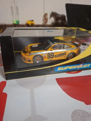 Coche de scalextric de la marca Superslot, modelo Porsche Gt3R - Color amarillo con detalles en negro y plateado. - Decoración con patrocinadores como Barclays y Dewalt. - Número de dorsal 99.