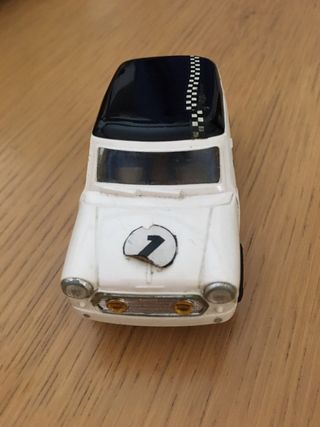 Mini Cooper de Scalextric Exin en color blanco. Modelo de competición con dorsal número 1. - Coche de colección. - Techo negro con detalles de cuadros. - Descripción ver fotos. - Funciona.