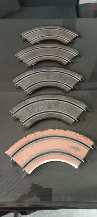 Circuito de Scalextric antiguo, ideal para coleccionistas y aficionados. Incluye varias piezas de pista y accesorios. - Varias curvas y rectas de pista. - Puente para circuito. - Cruce de pistas. - Alimentador y mandos (sin coches).