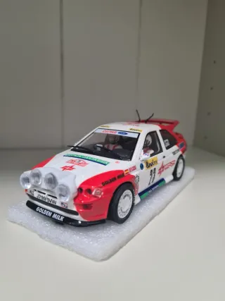 Coche de slot Scalextric Ford Escort RS Cosworth. - Modelo de rally. - Decoración Golden Milk. - Número 23.