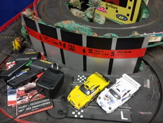Pista Scalextric o maqueta con coches y accesorios