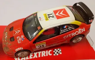 Coche de Scalextric del Citroen C4 pilotado por Loeb. - Réplica del coche de rally. - Diseño deportivo en color rojo. -motor 4x4 son luces -le falta el alerón trasero y los retrovisores,además tiene raja en el cristal a ambos lados . si tienes dudas o preguntas por favor contacta conmigo antes de comprar y te responderé sin problema.
