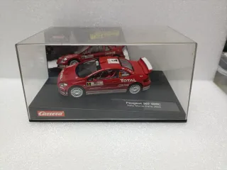 Coche de slot Peugeot 307 WRC, modelo Rally Monte Carlo 2004. - Escala 1:32. - Marca Carrera. -Es un coche de slot, también conocido como coche Scalextric. -Representa el vehículo conducido por Marcus Grönholm y Timo Rautiainen en el Rally de Montecarlo de 2004. -El coche luce el número 5 y los logotipos de los patrocinadores, incluyendo Total y Clarion. -El modelo está presentado en una vitrina de exposición.
