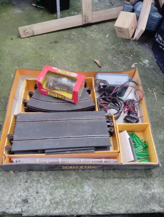 Set de Scalextric con caja original que incluye pistas y un coche. - Caja de pistas de slot. - Coche de carreras. - Componentes de Scalextric.