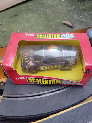 Coche Scalextric modelo Porsche Design Pro. - Carrocería negra con detalles en dorado. - Diseño deportivo. - Incluye chasis y motor.