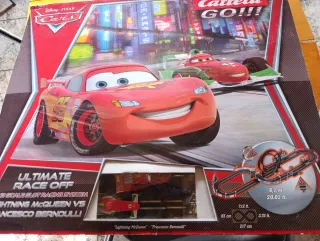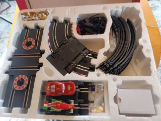 Circuito de carreras Scalextric Carrera GO!!! de Disney Pixar Cars. - Incluye los coches de Rayo McQueen y Francesco Bernoulli. - Sistema de slot 1:43. - Longitud total del circuito: 6,1 m (20.01 ft). - Medidas del circuito: 83 cm x 217 cm.