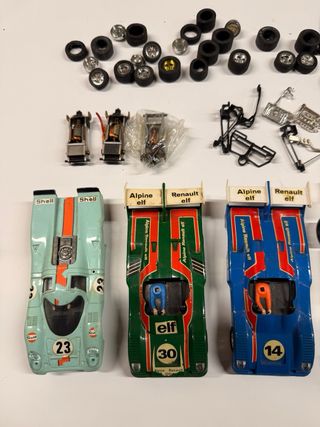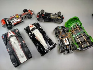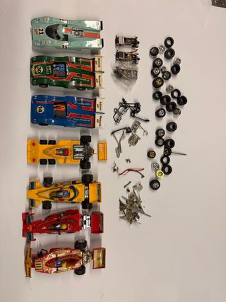 Lote de 7 coches de Scalextric, listos para la competición o para completar tu colección. Incluye varias piezas de repuesto y ruedas. - Coches de diferentes modelos y colores. - Piezas de recambio para reparaciones. - Ruedas de varias medidas.