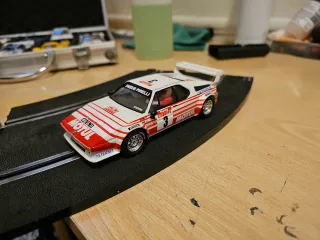 Conjunto de 5 coches de slot BMW M1 de Scalextric. - Coche 1: Rojo/Verde con alerón verde. Funciona pintado con aerografo - Coche 2: Blanco/Rojo con dorsal 3. Funciona el motor pero no tiene escobillas - Coche 3: Blanco/Rojo con dorsal 10. Ni motor ni escobillas - Coche 4: Blanco/Rojo con dorsal 3. Funciona - Coche 5: Rojo con círculos blancos y dorsal 80. Funciona