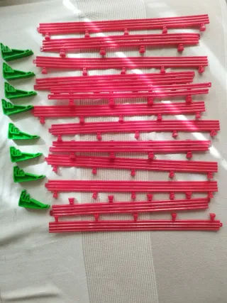 Conjunto de piezas para pistas de Scalextric, ideal para ampliar o montar tu circuito. 8 rectas 16 curvas 6 rectas 175mm 10 bordes curva verdes 4 cierres de curva verdes 8 bordes de curva blancos y rojos 3 soportes de puente 1 pista de conexión 14 vallas rojas Las fotos son parte de la descripción